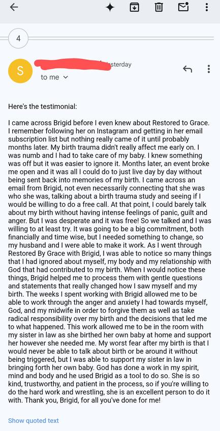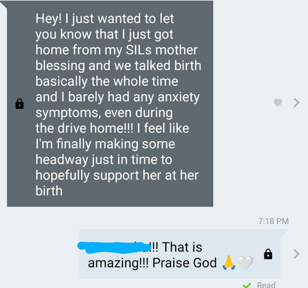 This whole experience has allowed me to truly see how much the work I put in with you has helped me. Even though the only confirmation of a healthy pregnancy I have is a positive test from 4 weeks along, I’ve been so calm this whole time. It is truly by the grace of God that I found you and am now able to walk through this pregnancy with no fear or anxieties and have complete trust that whatever happens it is God’s plan!